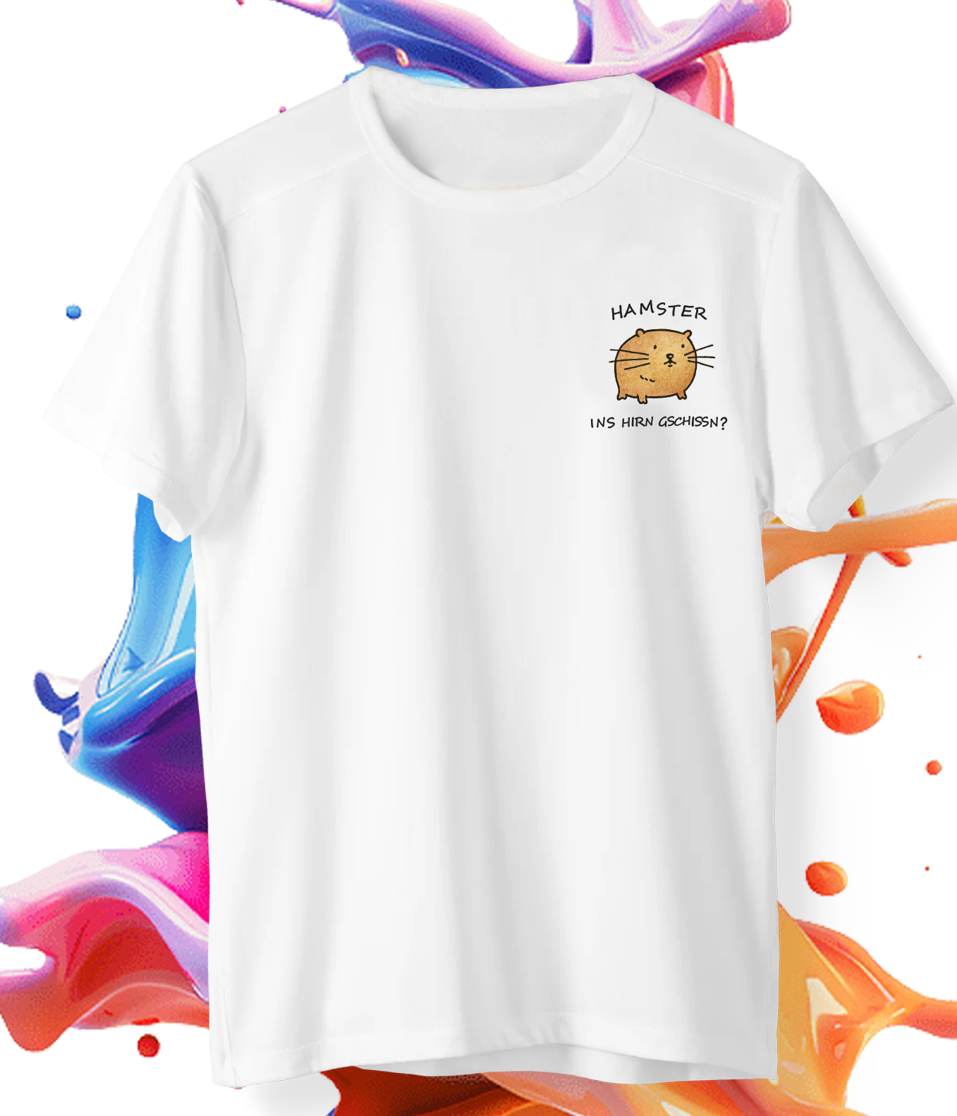 Das „Hamster ins Hirn geschissen?“ T-Shirt kombiniert minimalistisches Brustdesign mit einem der trockensten Sprüche überhaupt. Dezent platziert, aber unübersehbar für alle, die genau hinschauen.